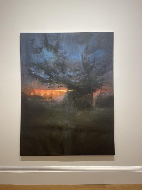 1: Matte surface, long canvas split in two by the horizon. Below, foggy green, dark with moss and shadows. Even the colour isnāt clear. Above, the dark sky is covered by the silhouette of a tree. Its branches are glowing with a blue light. Itās weirdly luminous, weirdly dynamic. It glows upwards in streaks like some kind of miraculous smoke show. The leaves are piecey, little dashes and hazy blurs. Itās like when you look at a tree with squinted eyes, pulling it out of focus. There are gaps where the skyās dark wash denim blue pulls through ā a cloudy spacious mess. The middle is torn open. Orange light splits across the horizon. I donāt know what to do with myself when Iām confronted by light like this in real life. I donāt think, my brain turns to a kind of chronic buzz. I know I like it, maybe even love it, but I donāt know why. I donāt know what it unlocks within me, what quality that space has.