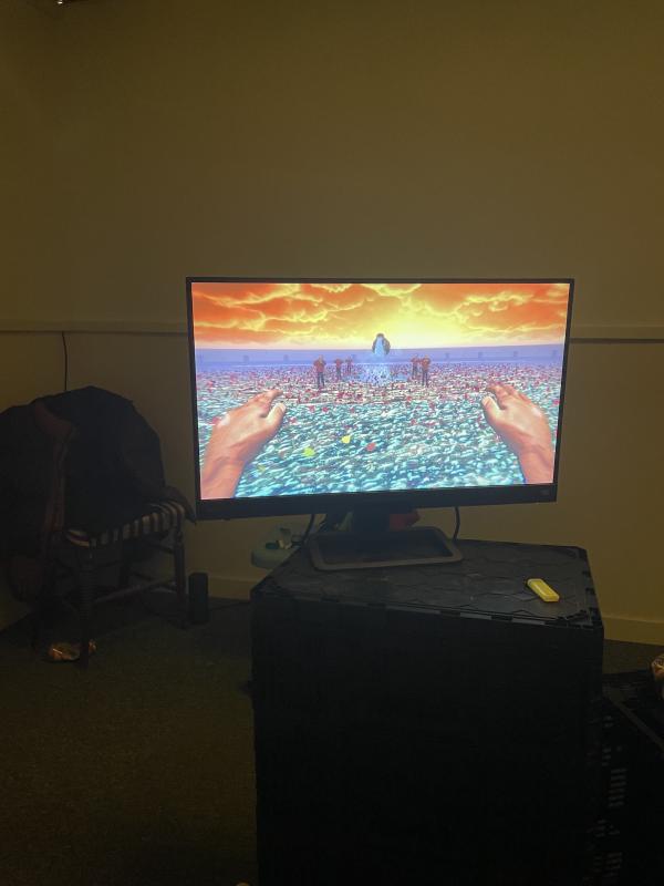 In real life, someone else was trying the keypad on the door. I could hear the beeps. I didn’t have enough time to go through each interaction again to find out if there was more, so I gave up. I left through the fire exit and found myself back outside the newsagent, blinking under the bright white gallery lights. I am still not quite sure what happened while I was within the show. After, scrolling on instagram, I saw that I had in fact fucked up. If I had left the package and turned back round to walk through the fire door, it would have led me to a dream space. The door would have opened out onto an open horizon, sea bright blue at my feet, sunset bursting orange with heavy clouds. There would have been flower petals in the water, rippling along on glowing waves. The pixellated guys would have been wandering around under a floating clay jug, pouring magic water out in a thick stream. The spray would be hitting the water, bending reeds and grass under the force of impact. I could have spoken to the guys in this space too, navigated some tense encounters even in this dream.