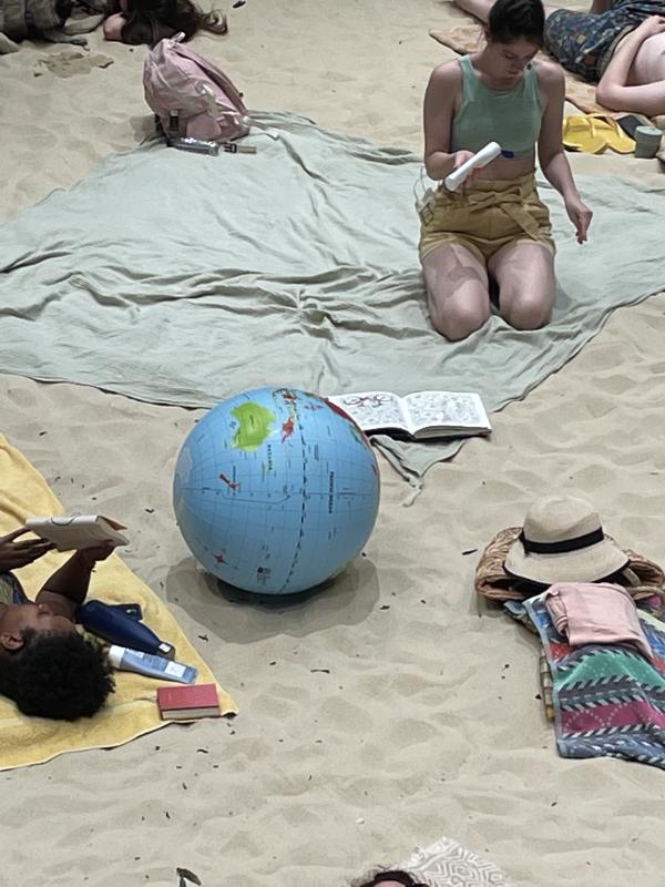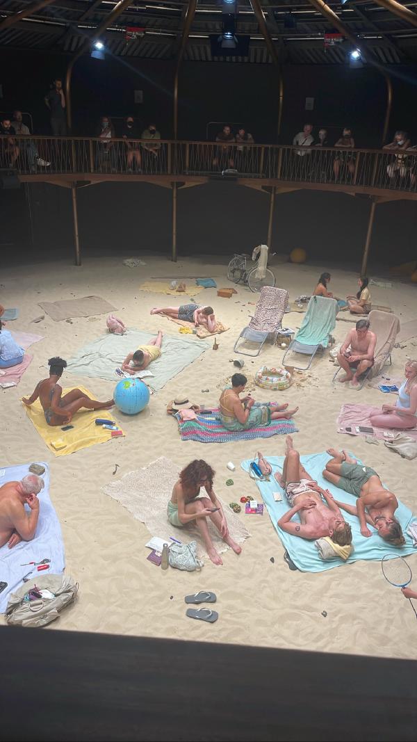 Kanye West Presents Good Music Cruel Summer. Creepers is playing and the world is on fire as the boys rev their engines down the high road. Tinted windows rolled down, they wait for me at the zebra crossing, bass pulsing through thick air. The air in The Albany is thick with heat too, a skintight atmosphere. I am here to see Sun & Sea. It has been billed as an opera about climate change and I think that sounds like a weird, surreal thing. The stage is lit bright and warm. A circle of sprawling sand, I look down on it from the darkened balcony that runs round the circumference. We, the audience, are gathered at the railings to peer down at the bodies already below: sunbathers and beach bums and people on holiday.
