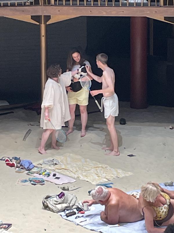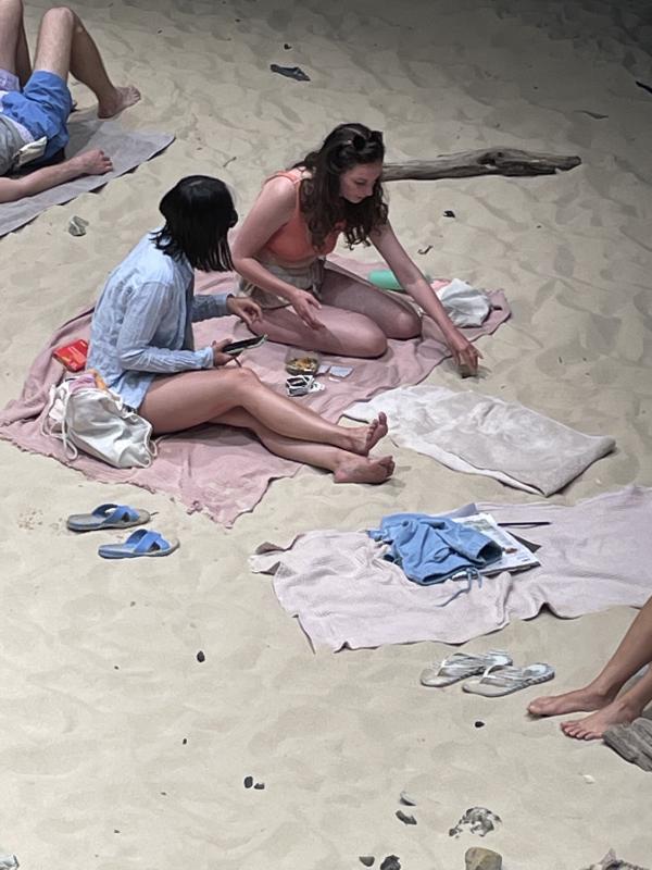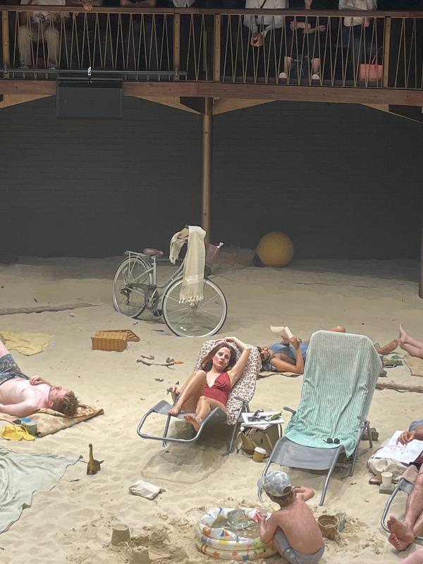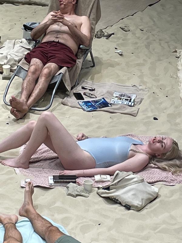 Maybe another critic would make more of the way this performance functions as a work of theatre. They would gush: it is so clever, a cycling melody that spills out of itself, offering a view of something on a planetary scale by peeping into the interior lives of these random strangers on the beach, their silly little fictional lives blown up like a panoramic shot on a postcard. We, the audience, peer down at the performers like they are in an enclosure at the zoo. The stage is a vitrine containing curiosities of a time gone by and we disappear into the story. But there is a rippling undercurrent and we experience it without really realising. Maybe Sun & Sea is important because it historicises? It is documentation for a time when the beaches are fried and the fish are all belly up on the sand, salt crusted and rotting in the acid rain. Maybe one day the beach and the sun and the sea will all be mythological fiction, a story we tell kids about like ~back in my day~ or Henry the eighth.