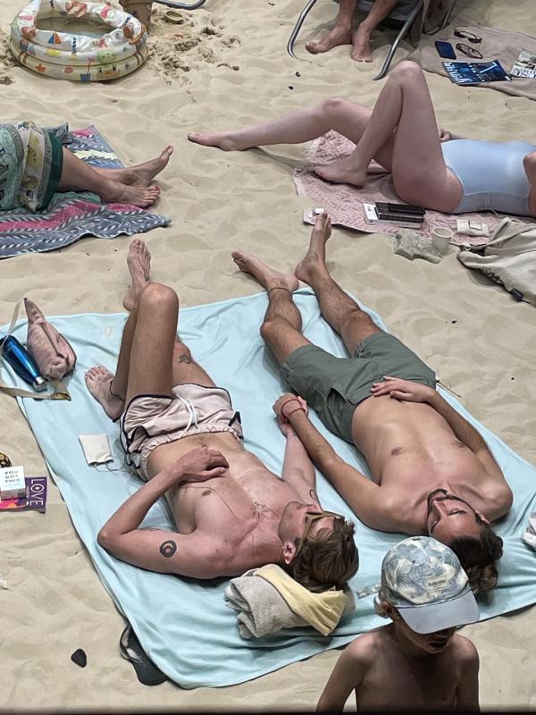 A dog bounces over a strewn towel, interrupts a game of badminton. A couple wearing sunglasses are reclining on a large blue blanket, they hold hands lazily, sweetly. A young woman is reading Weather by Jenny Offill. Her partner leaves the stage only to return wet, drying his hair with a towel. Suncream and flip flops. A box of grapes (mixed half and half, red and white). A child kicks an inflatable globe, he interrupts a woman in a sarong who is calmly knitting. 3 besties laugh and play cards, eat meal deal salads and tap away on their phones. There is a plastic dinosaur figurine, I think itās a Brontosaurus? Its stubby legs have been pushed into the sand.