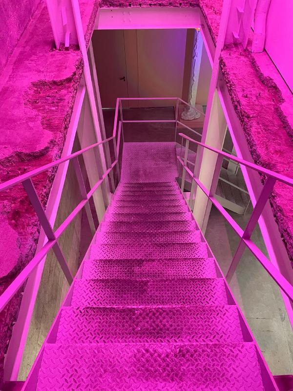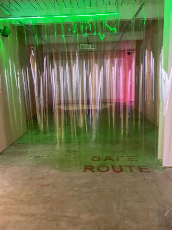The gallery looks like it used to be a car park. There are steps up at the door. The concrete floor is rough and cracked. SAFE ROUTE in red stencilled caps, spray painted on the floor. The walls are baby pink and the lighting is green overhead. I feel like I am in an enormous mouth, about to begin my journey through to the gentle wet darkness of the small intestine —- to see Tai Shani’s exhibition at Gathering.
