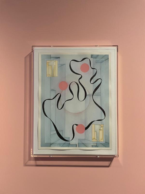 I think Tai Shani’s work makes an aesthetic gesture. It moves towards things, rather than being about things. Your Arms Outstretched Above Your Head, Coding With The Angels at Gathering. The pink walls in the entry are lined with A4 prints: little spacey ribbons dance and twirl, disembodied across empty, resonant spaces. The resonance is implied or projected. I am telling you, take my word, something is echoing across these fields of open colour. Little windows fold architecture together and apart: stairways and arches, cloister, colonnade, vault, crypt. The images are punctured by dense circles, opaque and heavy with their own pigment. Thick pink, baby blue, ochre and orange, but most importantly: black. Rot and spore, lurid colour.