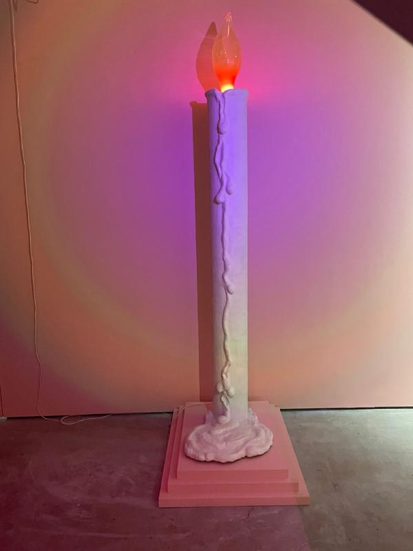 My body is drawn to the hot pink neon glow of the stairs. I tumble down them into a basement (a crypt). It would be a crypt in the same way our stomachs are crypts; dark, the gentle wet pink of interior lining, coated in bile and webbed capillaries. Votive, offering: a giant candlestick towers above us. Cartoon drip melts in a steady stream down the length, into a pool at its base. Static and solid. It’s a prop. It’s camp, or kitsch — I can’t tell the difference anymore, can’t decide. It’s in the space and its giant-ness makes itself known, my body reacts. A relic in a glass orb: a tiny disembodied mint green hand holds two disembodied eyes on a stalk. Saint Lucia, virgin martyr. She gouged out her own eyes, or her eyes were gouged out — on the orders of the emperor or a spurned suitor or — well. She carried Dante to the gates of purgatory as he slept.