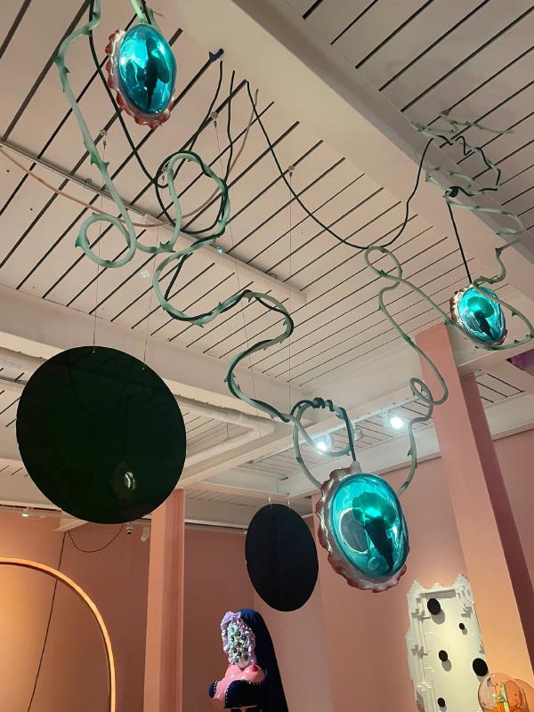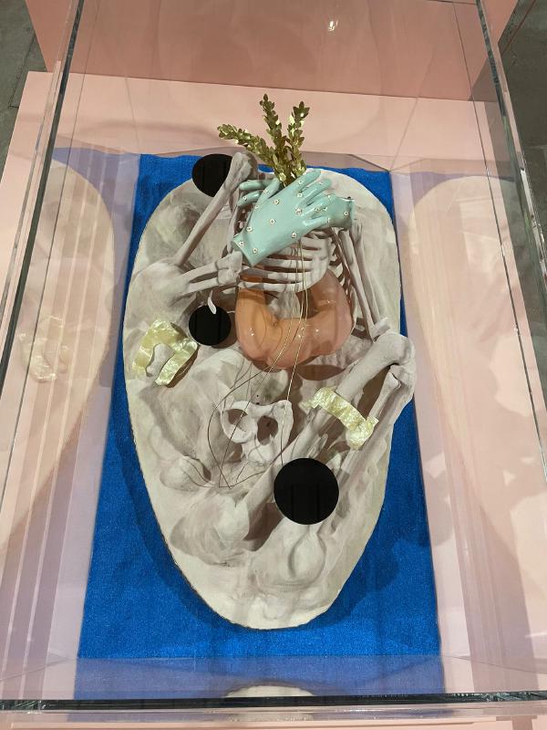 Then, a centrepiece: a gold colonnade, green coins the size of a fist, a disembodied mint green hand, a pink glass orb, amber prism. This is a collection that has fallen out of the reliquary. Flat black circles hang, suspended in the air above. They are horrifyingly solid, thrown into stark matte relief against glowing turquoise glass and green vines. The reliquary is behind, in a glass case: cast of bones (ribcage, femur, skeleton arm) with a mint green hand, holding a gold laurel leaf, containing pink glass, pearl shard, bedazzled by little fried egg studs. A relic of a saint: the sacred body, defiled by the gruesome horror of its death, or made more holy by the quality of suffering. Because through sufferance we understand the suffering of Christ, Man of Sorrows. The reliquary is punctured by flat black circles. It would be a crypt in the same way crypts are dark containers for a body unbound by horror, by sorrow, by suffering—