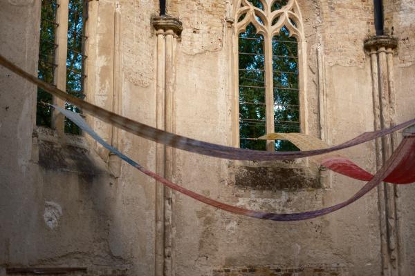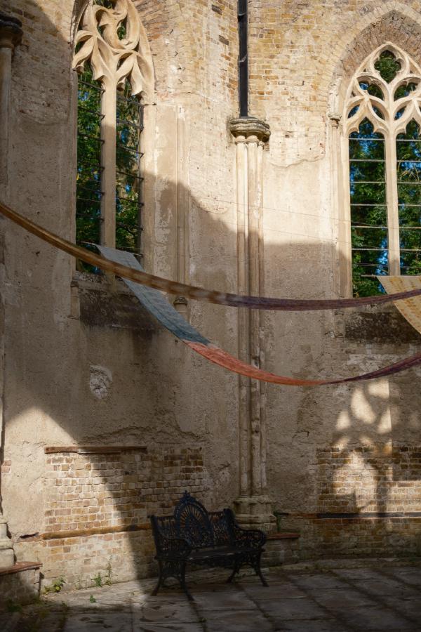 During our crit, Andie had these enormous cardboard tubes, inside, there were these silky little tapestries – the same ones pictured below, swagged like banners or hangings across the inside of the chapel.
