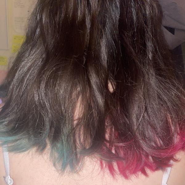 dyed half and half and .. half? god that’s thirds gabrielle. turqouise, purple, and peachy pink. I used Directions this time. I forgot how good it is. waiting for my fringe to grow a bit more so i can bleach and dye it again :)