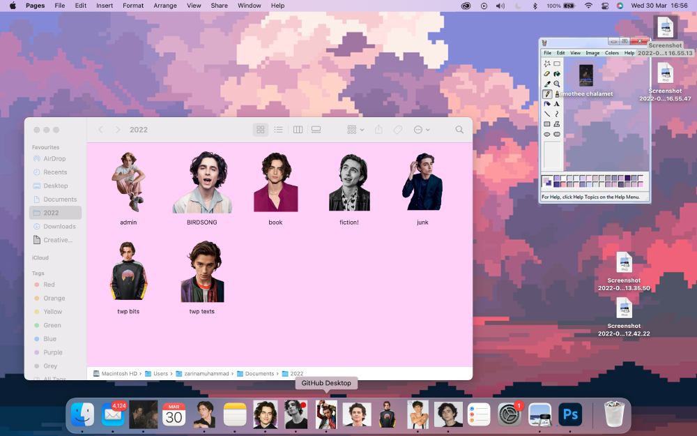 fun fact; as a good joke, i changed all my Mac app icons to little pics of Timothee Chalamet. It was a funny joke, until i realised that i didn’t know which app was which unless i hovered over it. it’s been like that for a few months and i’ve now gotten used to my insane system. BUT, i was doin a lil lecture the other week, and i had to open a file on screenshare. didn’t realise everyone could see my insane icons until i heard everyone GASP.