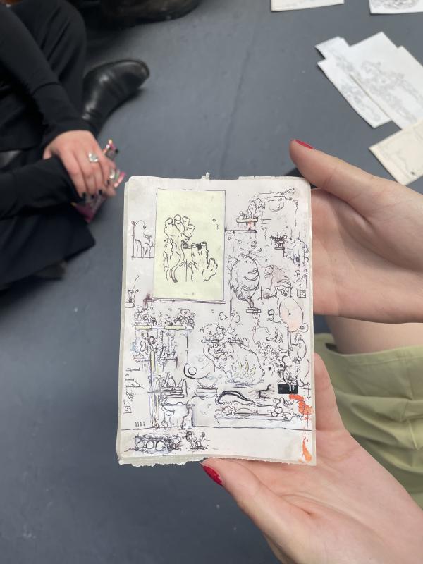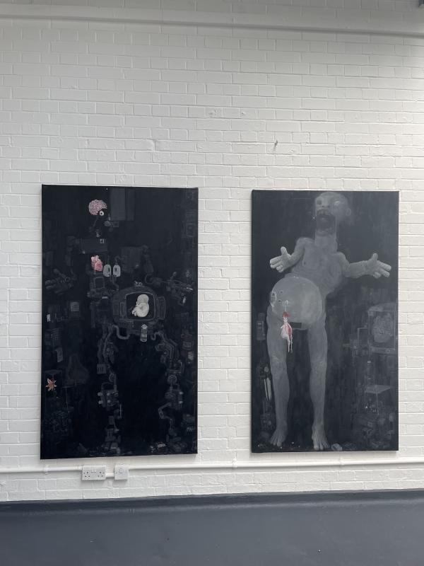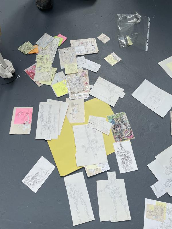 i felt like i could’ve spent hours with ali’s work just chatting through what each bit was because – you know when an artist just has hold on sooo much, you just want to spend the time rifling through it all, checking out every corner and aspect to make sure yu’ve not left anything, work that is full and bursting, spluttering ideas out like it’s dead casual. ali actually began by saying that the work on the wall – his paintings, sure, but he was interested in other stuff too, stuff beyond just Thing On Wall. he had writing and poetry and it was spoken aloud too – sounded like a real earl sweatshirt flow, rapidly brilliant and tripping over that brilliance with NEW brilliance. the words were accompanied by drawings, and they looked like retro futuristic visions, like something from a 90s anime, something vaguely body horror but also actually about alienated existence under late capitalism and life with the internet (not just after it, WITHIN it) life in cities in the west in the heart of an empire that was dying and what the end of all of that could possibly ever look like. omg they were amazing – and thrown about out of a folder, on slips of paper, in biro in pencil, on the backs of post its and torn pages. his paintings were still fucking amazing, even if he was past them, progressing on to newer brilliant ideas. they were layered and heavy with meaning, this metaphor or allegory. working through words and names as standins for visual puns. dytopian vision but done by a guy with a sense of humour so – at least if we’re staring into the barrel of the void, we’re chuckling before the bullet hits the back of our head and we tumble face first into beyond. it’s mad, i’m often a fan but this was next level. i was excited and in awe. one of those crits where i feel like aw yeah. i love my job.