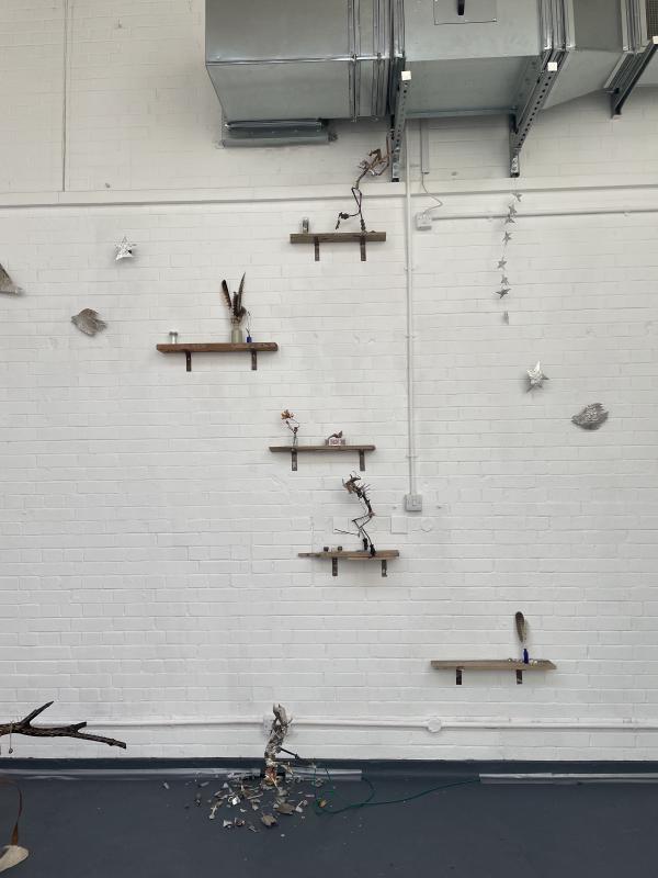 lee spoke about this work in such a particular way, it really struck me and interested me. like the spirit of these figures worked through the artist and lee was actually just a facilitator or the hands on the assembly line, with these sprites controlling the artists hands and the assembly process. the figures were fellows and they had a kind of autonomy away from the artist as an authorial authority (yes! so good, i like talking about authority and i LOVE talking about a refusal of it). the fellows were made of pretty to-hand materials, tin cans and sticks that had been whittled beautiful, but they weren’t necessarily about the transformation. it was more about their spirit because they were mischievous saboteurs. there in the pictures u can see them fucking with the audio playback, causing interference. as a mischeivous lad myself, as the proud owner of a rascal heart, i couldn’t help myself. i loved them. little aluminium stars and shreds of metal and all. they were climbing the wall, and i wondered if they ever made it out into the world, what they’d make of road signs and post boxes. the nooks and crannies of trees down residential roads. the council flowerboxes and pavement cracks. they’ve got places to be!!! i love them! here they are!