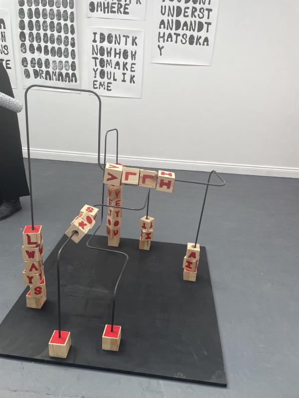 annabel’s work was so interesting because it was clandestine! a secret but, the kind of secret where someone’s like actually DYING to tell you something but you’ve got to get it out of them. you’ve got to earn it, you’ve got to deserve it because – i mean, secrets like that are always worth it. the anticipation alone is, that’s the entire point of a secret. it’s unassuming, all in the context or the surround sound. through the entire degree show there was this real theme or running thread of childhood nostalgia. the things from our past and a smaller younger state that we look back on with newer bigger older eyes and a new criticality and think of it as subject object and material. annabel had this huge – idek what they’re called but they have them in doctor’s and dentist’s waiting rooms for kids to occupy themselves with. i don’t remember much of my childhood (good) but i remember these. the words were burned red into the wood and the beads and physical spacing obscured that moment of delivery. interruption, maybe? but that was the clandestine-ness. it was interrupted obscured and tucked out of sight – at least out of immediate sight. behind it you can see prints where the words are squished up together with no spaces, making the syntax into a kind of image or a kind of block, a mass. difficult to read or access, but then again – who am i? a lowly viewer. how entitled! i love it when artists handle the viewer with a kind of cynical lack of trust. i think maybe it’s fine to ask your viewers for their complicity, their undivided attnetion. you should filter things out if you want to. my favourite obscuring action was (again!! sorry) unpictured, but on white card, annabel had embossed words. from some angles, the pages were just blank pages. at a glance, there was nothign there. just when you moved your head and payed attention. so subtle, so slight. it made me understand the work as not actually secretive for fun or for the sake of it – but because the work had hold of a kind of shyness !!!! i love it. i am actually still working out everything i think about that right now, isn’t that good!!!!