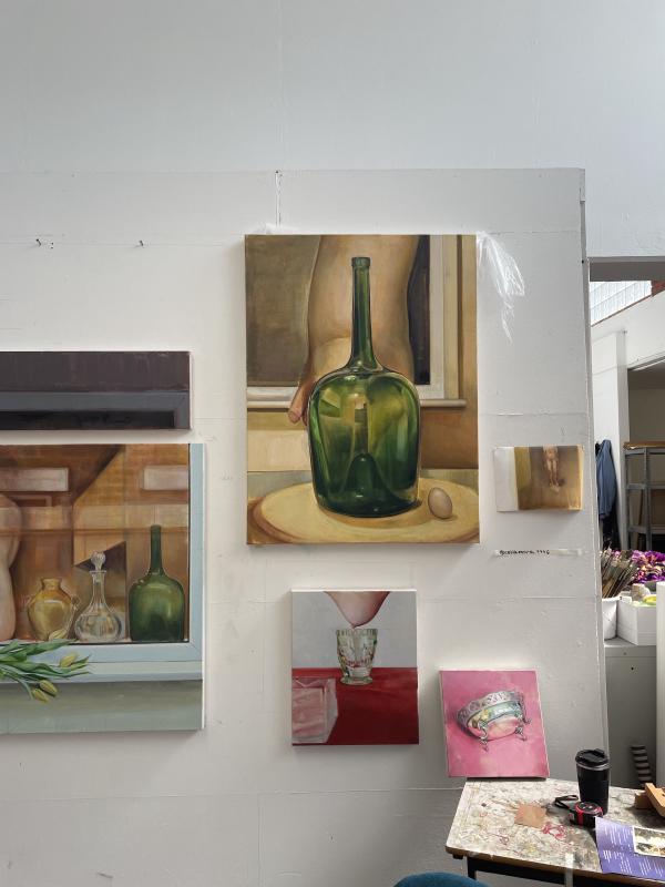 celia said she started painting her partner in lockdown, he was right there and they were all squished together in a shared room in shared housing. close by and comforting, as her subject, he put her at ease. she’d give him instructions on how to pose, she found that she could ask for more, ask for what she wanted because of the relationship and the trust that already existed in the background. the dynamic interested her though, the vulnerability and the power flip – rather than male painter / female muse, it was the other way round and now she had the paintbrush and the agency, she was holding the power that comes with being able to make the image and he was her subject and — actually, in some of the poses and paintings, he was becoming object. or periphery. or background! celia started introducing props into the paintings – beautiful glass decanters, bottles, vases. it was so interesting, before she told me these paintings were of her partner, i asked her about why she’d painted these glass vessels with more attention and precision and clarity than the male figure. the objects were front and centre, stand ins or proxies for another body, maybe her body. in one painting, she had placed a vase with all these different shimmering scales refracting the light, she’d put that between her and her subject and painted through the vase. it was a lens or a filter, a thing being used to obscure or see.