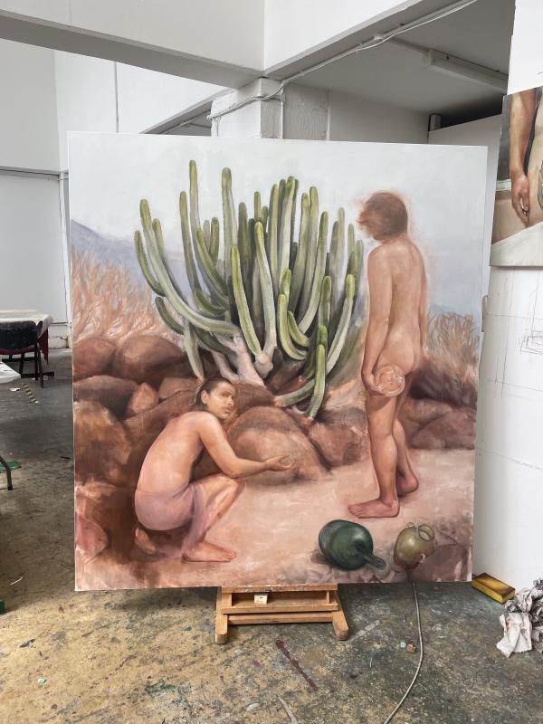 her newest painting for the leavers show – she was trying out something new and more ambitious. introducing narrative, a mythological or historical subplot. she said she grew up in madrid, going to see all these grand old paintings in the prado, velazquez and – all men. when celia mentioned velazquez though, i saw that bit in las meninas, that portal of light at the very centre of the painting, the open door where the painter is visible and reflected back at us in a mirror behind the subject. i thought it was so interesting that she’s been painting objects as proxies for other bodies, maybe her body, in a composition between her, her, and another subject! that was so satisfying, so cheeky and serious.