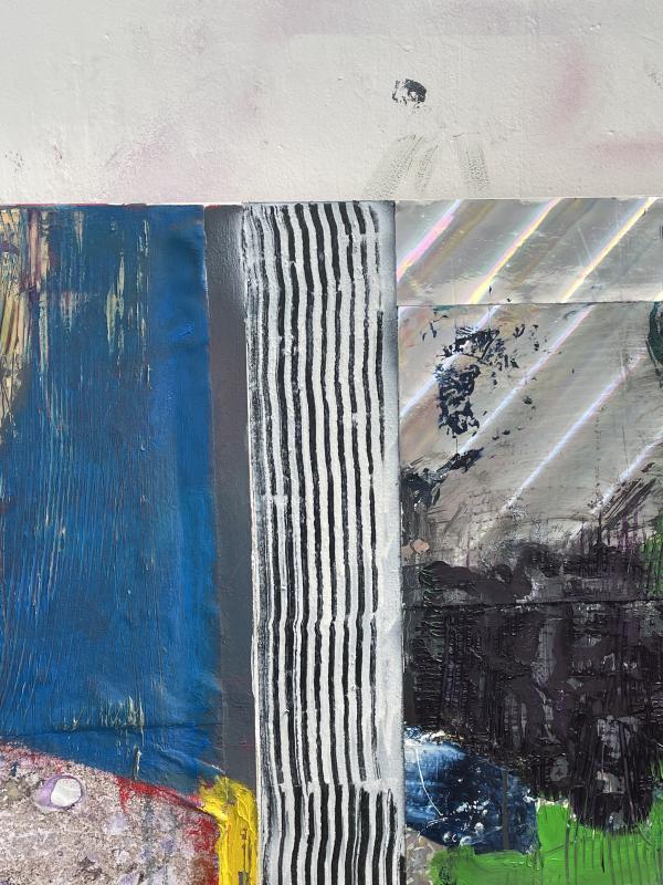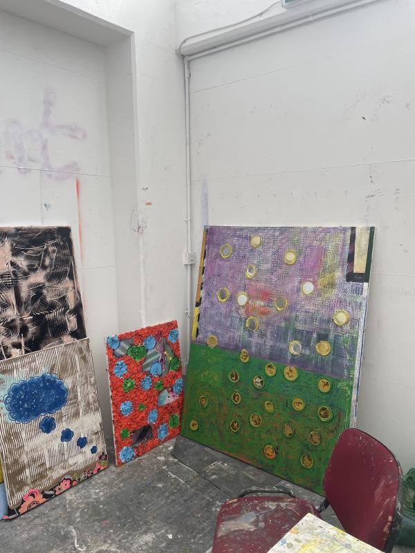 jordan first started describing his work by using the word knackered, which i found really interesting because it’s not a word i hear very often when i’m out and about in the world, but my mum uses it a lot – all the time, actually, it’s her resting state. it’s interesting because it’s different to tired – it feels more well worn, like post-exertional or used up, like whatever remains after the first press. an essential pulp-y thing. he said he was interested in the provisional space of the street, the visual language that makes up The Street: road signs, flypostering, scuffs and chewing gum and wrappers and STUFF. this is a kind of provisional visual culture, because it’s there to grab attention, sell u something, cut through noise or blend in and help out, it’s there in service of another thing (us on our way somewhere else). what an interesting place to start thinking about painting from!!! jordan was using holographic surfaces, dog hair, sand and this weird foamy hard substance that looked like blutac – like, he was using it as a kind of blutac, to stick bandages across a canvas and press tin can circles into a studded constellation. he spoke about how he was interested in naffness, and less and less interested in using a brush, more and more interested in cutting and sticking, using tools and implements rather than fine tuned things. i just think his work was so fun, there was something really joyful and rambunctious (is that how u spell that??) about the enjoyment of naffness, the enjoyment of cutting and sticking – these physical, messy things, these decorative but unprecious forms of culture. painters painting but also people living: loud and human and full.