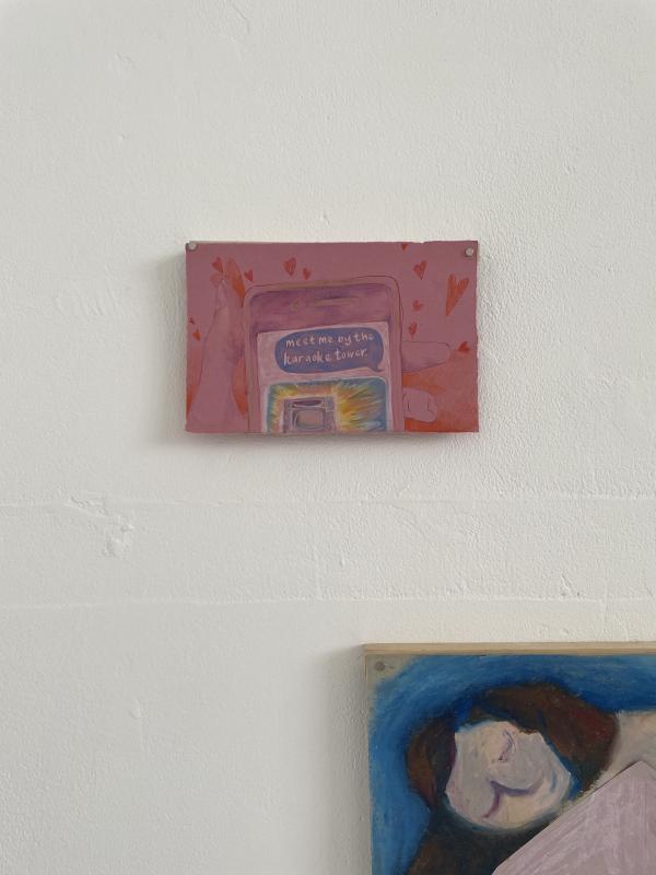 mark told me he’s been mixing his pigments in this new way that feels like cooking, the way he does it means that the paint can kinda be washed off – which i feel like i don’t want to believe – that such a luminous and definite set of colours could be Not Permanent, i find that quite destabilising. but the colours look so different when they’re wet, the painting dries and it’s almost like a surprise. he gets very present and pays a lot of attention to what he’s doing when he paints. he is focusing on the movement and the marks, he is trying to wrestle with the idea of an image that is an image of nothing, no figure no object, not an image in that sense but maybe the image only comes forth once he’s done with it. the image works through him and arrives to him slowly or as a surprise. i don’t know which version of that it is, because i found mark’s paintings so satisfactory and full of like this inner content, this inner silence. they were harmonious and complete, in a way i haven’t encountered much. i was glad to see them, happy to sneak continual looks.