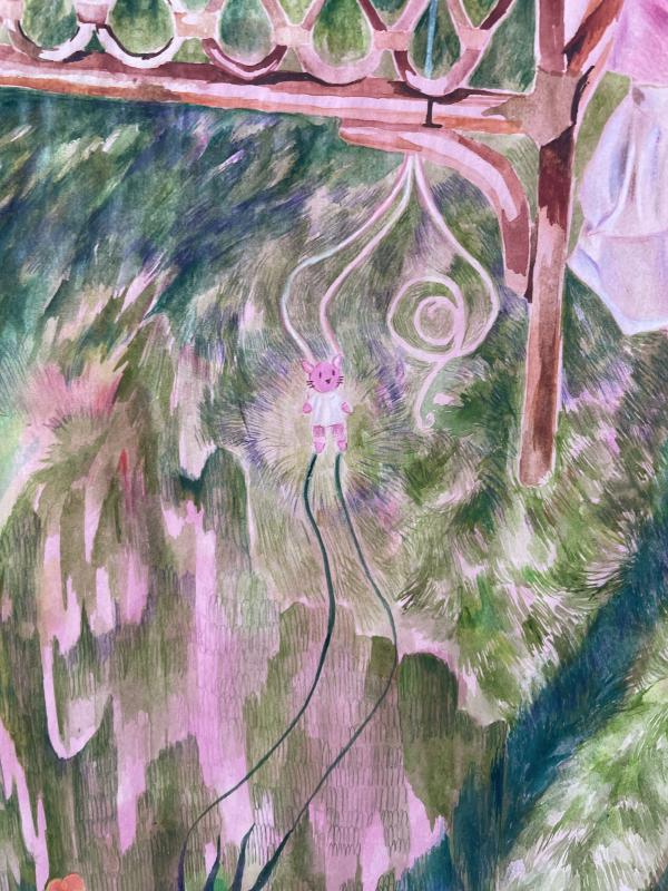 both were dealing with a sense of childhood in image and object, childhood and maybe actually girlhood specifically as a state, an experience, an aesthetic culture of its own (an aesthetic culture that can be alienating, bizarre, freakish as well as lovely and romanticised and pink). jess had these very perfect, sweet but sharp drawings studded all across almost every wall. they were pink and colourful in the way of like, those secret diaries of notebook girls. i was a notebook girl with secret diaries (ofc i was). like the visual language of groovy chic and pencilcases, glitter pens, fluff trim and those bubble keyrings where confetti would shift through snowglobe liquid when you squeezed it. that is all FASCINATING visual and aesthetic stimulus, and jess handled it sooo lightly and deftly, chewed it all up and spat it all out onto a plate i was inspecting. great!!!!!! melanie’s work had this earthier feel, these clean wire frame shapes, matrix version of nursery objects (crib, swing, rocking horse). bare and bone-y, with this flat rectangle of clay smeared and spread out with the finger marks left pressed in so you could see the artist’s gestures – wild and grubby and not entirely sure if it was fast or violent or slow and balletic but imagining the lines tracked all the same. in person the work felt like strange alien objects, or alienating rather than comforting. that flip where an artist makes you feel a feeling that’s the inverse of the feeling you associate with an object – it’s sharp, immediate and apparent. spatial too.