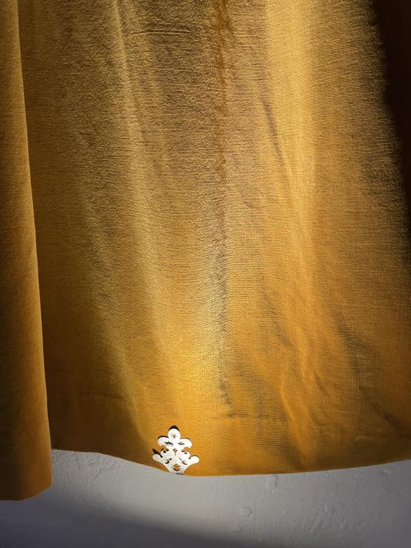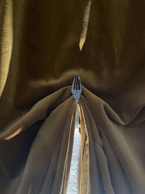Anna Mud’s Moral Fibre is installed in a sunlit room, upstairs in Newcastle University’s Fine Art Degree Show. Long sheets of translucent white organza are tacked up along the wall. The fabric is so thin and sheer that you can see the texture of the room’s magnolia walls and the dust on the plug sockets. Across the organza, there are blossoming soft black patches. Anna Mud has positioned two wooden benches at the other end of the room. From this viewpoint it looks like black mould. Up close, you can see the patches are made of short, hazy fibres tangled into the organza— velvet fibres. They’re straight and splattered across the fabric like confetti. But from that bench along the far wall, you are a spectator beholding a terrible blooming pattern of black mould and you are listening to a soundtrack of someone coughing the same canned cough in a ryhthmic repeating loop from a speaker that is right next to you. There’s a wall text that slices the work open; rising rents and cost of living crisis means people can’t afford to heat their homes. With the UK’s cold damp climate this means black mould. With the UK’s rental crisis, this means landlords shirking their responsibility to prevent and remove the mould, this means tenants have to live in rooms full of black mould. Historically and traditionally, velvet was made from silk. It was a precious fabric, subject to English sumptuary laws that regulated clothing in relation to your social status. Velvet was exclusively worn by kings and nobility.