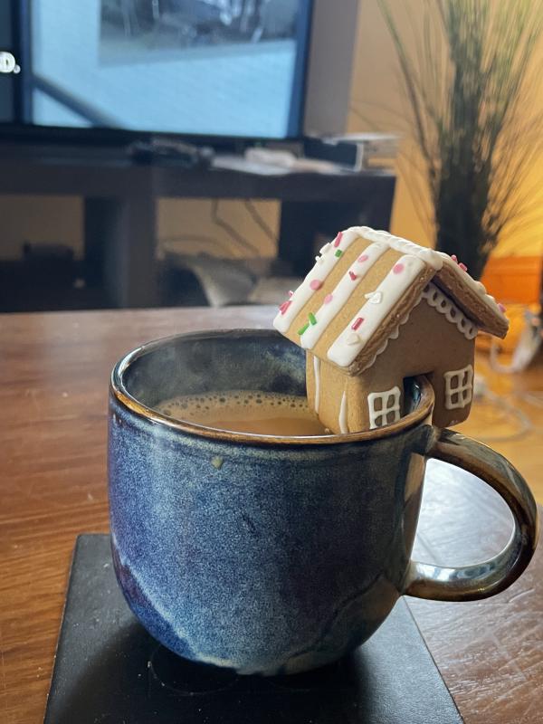 how cute is this::: a lil gingerbread house mug topper. almost too cute to eat (ALMOST, bc i did actually yam this in one bite)