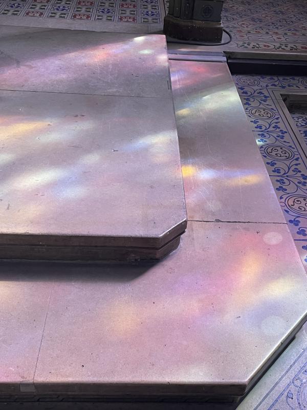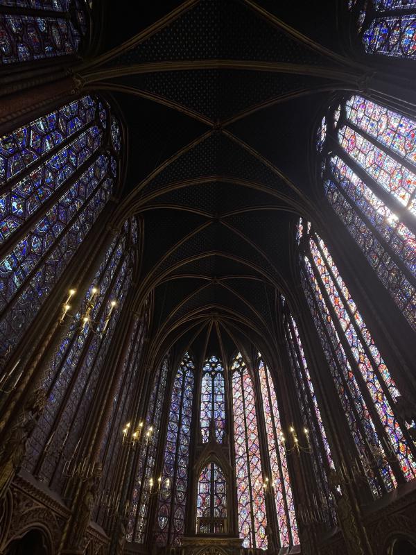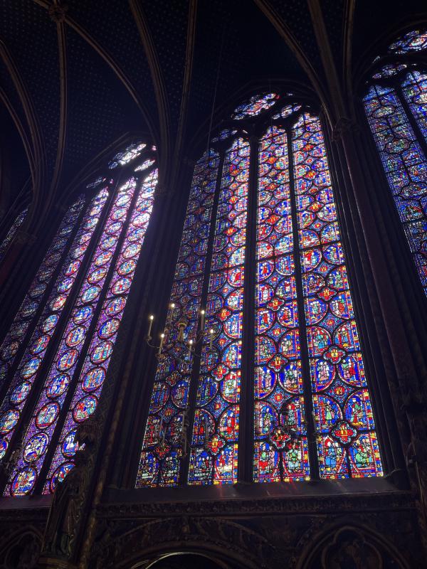 also! went to sainte-chapelle — it’s an old royal chapel from the 13th century, on that litle island, that sliver of land in the middle of the seine. and i have literally always wanted to go. obviously, it ticks a lot of my special interest boxes bc it’s from my favourite: medieval times, big gothic vibes, lots of history to excitedly bore my bf with. (the chapel is home to relics of the passion of christ, it was built as a kinda medieval power play so the king of france could make paris this religious centre of gravity.) but it has a really crazy, like truly astounding stained glass window situation. it’s not that big of a space, but this tiny chapel is like two thirds stained glass window and it towers up so high, wraps around you so you feel like you’re actually IN a kaleidoscope. the windows narrate whole chunks of the bible, they are detailed and tiny and they glitter in the sun.