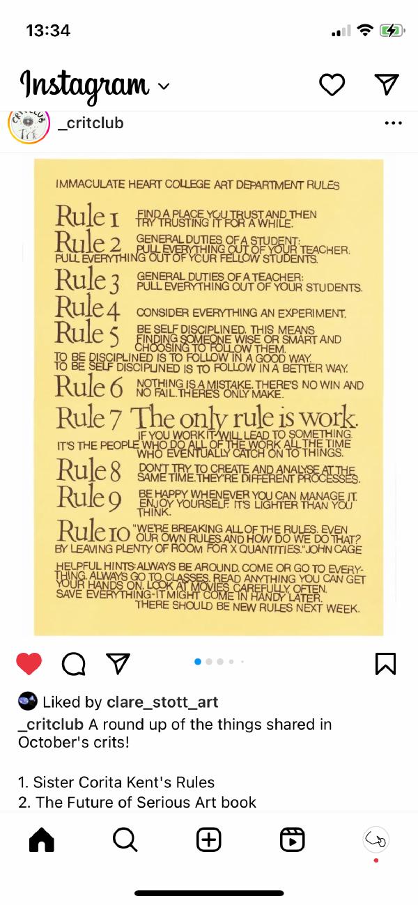 i think i have really complicated feelings about work, and art’s understanding of itself in relation to work – see WELCOME POMODORO!. but just generally, i think we could and maybe should move beyond an understanding of life as defined by work, our abbility to work, the quality of work we choose to do. i think, really i think, maybe work is a bit shit and a bit washed and when people say they hate work or don’t want to, i really sympathise and think they should do whatever they like. but at the same time, the work we do here at twp is such a defining part of my world! my understanding of who i am and it’s a source of pride and satisfaction – i never know if that’s healthy, but it just is what it is. i enjoy my work! and i understand that that is a kind of privilege and that it makes me the luckiest girl in the world – but i also shouldn’t be the luckiest girl in the world, we should all be this lucky. y’know? anyway – i liked these rules. they felt like something that confirmed or affirmed me, and they also stretched me a bit. because who and what am i if i like these rules, especially the one about work. but also, what do these rules mean, in practice? i’m overthinking it, not everything needs to be chewed over at that high octane phd galaxy brain thought level. some things are just nice. maybe this is just nice!!!