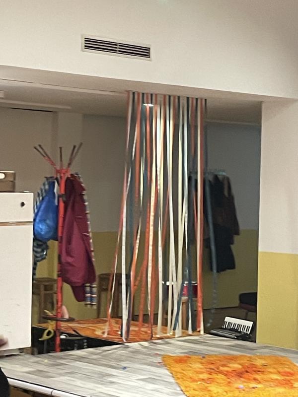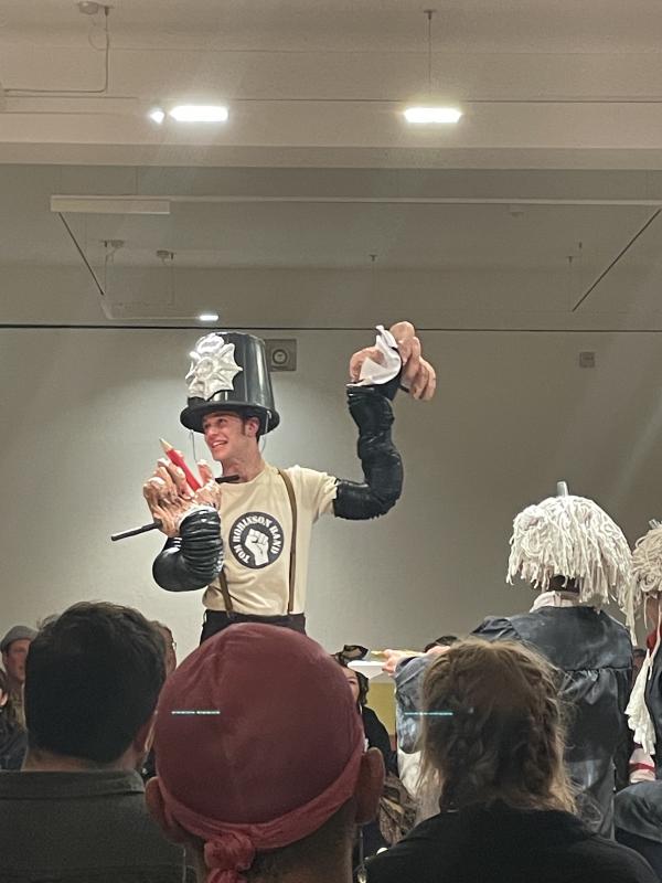 one thing i absolutely fucking loved more than any other bit tho WAS: the scenes were intercut by these vignettes where the characters would put on panto puppet outfits and perform little punch and judy skits. it felt so english, so 70s, but so fucking raw and good and packed into itself. there was MR PUNCH, this panto patriarch in a dressing gown and nightcap, with a moustache held up on a stick, JUDY (aka MRS PUNCH), a queer son, son’s boyfriend, and a POLICEMAN with extendable arms and enormous ham sized fists. the costumes for these skits were also makeshift and rough. the policeman’s hat was an enormous black bucket. the lawyers (there were lawyers) had actual mops on their heads instead of wigs. that was a kind of comedy in and of itself. but the skits were directed by a frantic narrator, the characters skipped about on stage, corpsing and wink wink nudging. it was a kind of slapstick, a kind of meta-comedy. it was soooo fucking good, the best bit. because it was raw and rough and also sooooo tight and clever. apparently these skits were written by the gay squatters' theatre co-op, the Brixton Faeries, this particular company’s predecessor. they’d put these skits on in like, the literal streets. as street-theatre, political intervention, agitprop. i think they might’ve been using the actual scripts they wrote. which is incredible! what an amazing source amterial to work from! here’s more info about the Brixton faeries, if u, like me, want to know more about that.