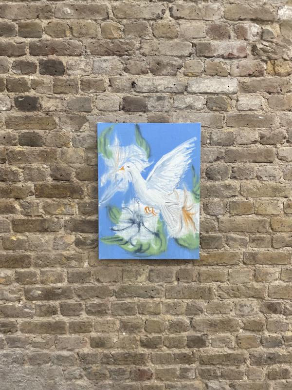 popped in to phillida reid on grape street, a gallery i still hadn’t been to before — dyou see what i mean? i’ve not seen anything recently!!! kind of a group show: Ann Craven with Robert Mapplethorpe and Mohammed Z. Rahman. i didn’t want to look at the handout and find out whose work was whose. looking at it now, from what i can gather, ann craven did the dove paintings with robert mapplethorpe’s photo of patti smith (holding dove) in mind, Mohammed Z. Rahman’s paintings also featuring doves adn love as a theme feel like a good duo show match.
