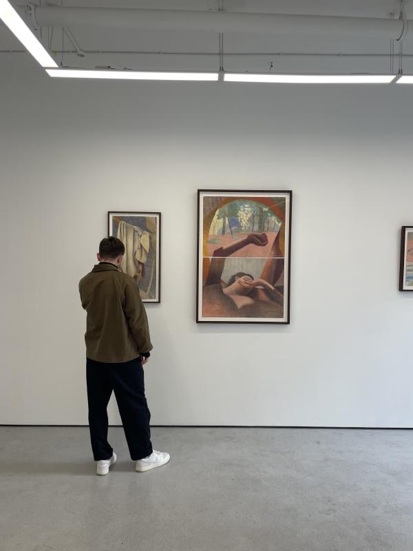 and the perspective warp in rowley haynes' drawings was very pleasing. the way bodies stretched out, like the entire image was yawning. i also found a vicarious pleasure in the marks – they were drawings, coloured pencil making blocked off zones of even colour, scratchy expanses plastered over. the colour left gaps where the grain of the paper took over.