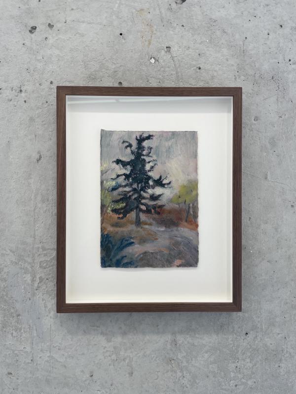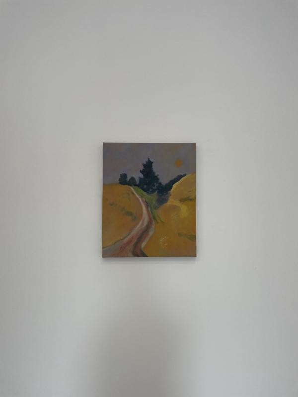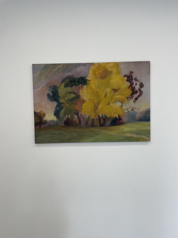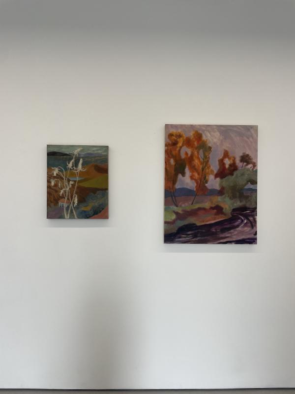 i found myself vibing most with sammi lynch’s scratchy blurry landscapes. i got all up close and personal in their space and found myself wondering if they were painted drectly onto raw canvas. no primer, no underpainting, no grounding layer of thin wash to break the ice of introduction (paint, meet canvas. canvas, have you met paint?) the marks made the world of the image feel like a hazy blur, not the whizzy movement of looking out a train window, the static fuzz of squinting until the world falls out of eyeball focus. and the colours and shapes looked like they were on fire and dancing – rly lovely paintings!!!