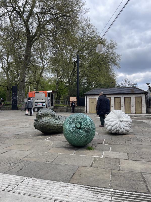 veronica ryan’s windrush comission in hackney central! it’s: three sculptures of Caribbean fruits β Custard Apple (Annonaceae), Breadfruit, (Moraceae) and Soursop (Annonaceae) β in bronze and marble, installed in Narrow Way Square on Mare Street.