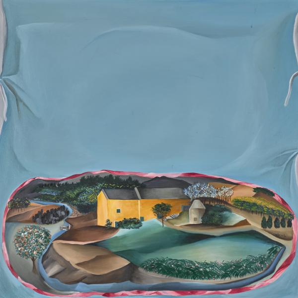 MAN EATING JALEBI (1975) The horizon line sits at the very top of the square canvas. Thereās only a slither of sky and it is mostly baby blue. A hilly shoreline bends and tapers off into the sea. There are rolling green hills, baked golden on one side by the setting sun. The sky blushes packet pink above the hills, like the land is leaking or glowing. Beneath the hills thereās a cluster of boxy white buildings with orange roofs. Palm trees and grey rocks, orange sand bulging out into a thin curved beach, almost a headland at this angle from across the bay. Between us and all of that, thereās a flat smooth sea, brilliant cyan blue. It is serene, so calm and glossy. No waves, only patches in slightly different tones that skim across in wide curves. Up close in the foreground, against the very bottom right of the canvas, a man sits at a creamy beige terrazzo table. His face is a smooth salmon pink gradient. The shadows are alizarin crimson. He looks like heās being lit from beneath. He is wearing a brown brimless hat and a striped white shirt that shimmers with pasty colour - pale blue, green, pink and yellow. His arms are propped at an angle on the table between us, broad shouldered with a pointy elbow. His hands are large and strange. The right hand is cradling a thick blue plate with one sweet, a bright orange spiral in a perfect circle - itās a little jalebi. He is holding a second jalebi to his mouth with his left hand. His lips arenāt parted, they are thin and dark, sharp like a razor cut. He is separated from the rest of the scene by a bright red railing. Between this side of the bay and the headland on the other side, there is a thin dark highway. It cuts across the perfect blue plane of the sea, tearing it in two. A car hunkers down in the right lane on its way over to the other side. It is plastered at an odd angle.