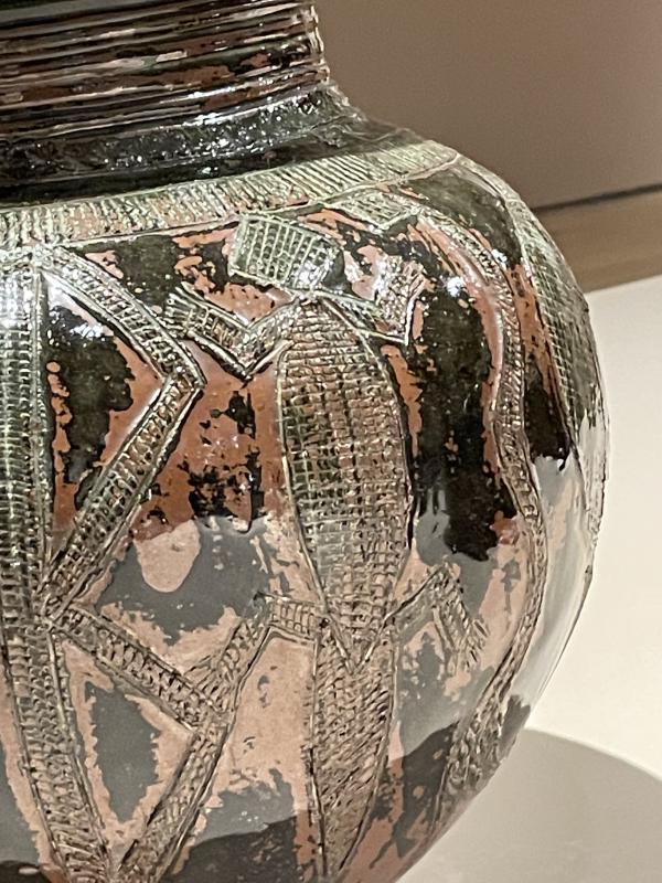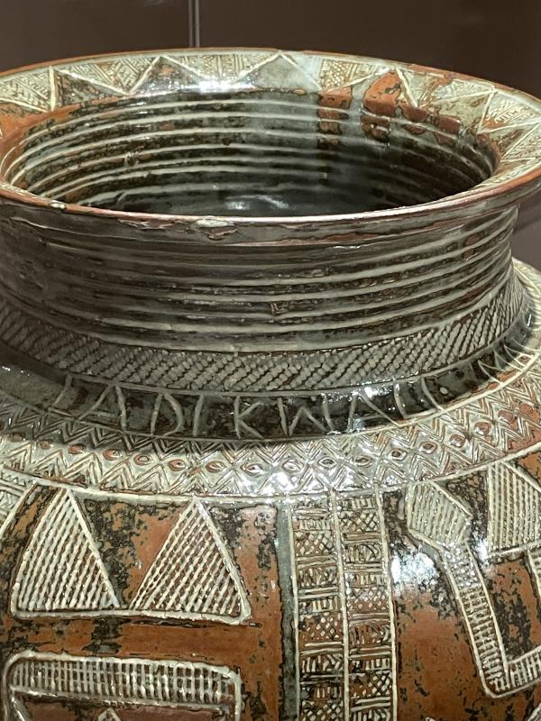 At first, Cardewās trainees were all men. But then our two main characters meet - Michael Cardew stumbles across one of Ladi Kwaliās Gwari pots and he thinks theyāre great. He invited her to join the Training Centre as the first female potter and she becomes a star pupil, hybrid ceramic form emerges and the rest is history - on display in this gallery in front of you, pottery as a field was changed forever. Great - that could be the end, couldnāt it? Thatās the history, thatās what happened, we can see the pots and we know their backstory. But I have some questions and I want to think about them with you. I donāt know if itās the same for you, but there are so many parts of this neat cultural backstory that make me feel deeply uncomfortable. For one, thereās a colonial discomfort; the pots have an entire backstory where they exist because of colonialism and the interventions of a colonial government. I donāt know if that changes the way you feel about them, but if it does, I wonder about the quality of that shift. What exactly has shifted? How has your opinion of them changed?