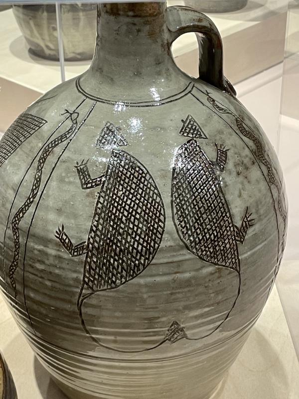 But while we look, Iāll tell you about them. Here on the first plinth, there are four pots of about the same size and shape. They all have round bodies that swell out, they dip in at the neck only to flop out at the lip. Theyāre a little bit wide, not very tall. They all have a similar dark green, or maybe blue, earthy tone. Itās the kind of colour that shifts depending on the light and the angle, sometimes black where the shadow sits. There are different patterns scratched into the surface of each pot, like theyāve been carefully etched out. Two are covered by detailed geometric patterns: little diamonds and lines running round in bordering strips, checkerboard panels interrupted by drawings of birds and crocodiles. The animals are geometric too, with sharp angular bodies, flattened into the essence of their own shape: triangular tails, tilted wings jutting out, heads that are perfect squares. The third is simpler: just strips of differently weighted lines and dots, texture and pattern rippling up across the surface in agonising detail. The marks are scratched in so finely, it almost hurts me to look. The last pot is slightly different. The colour on its surface peels away, exposing little bronzey orange patches. When you get close, it looks all dappled and glossy. There are those geometric style animals going round in long vertical stripes. I canāt tell what all of them are, but I can make out a crocodile again (with its round flat body, wide ribs and little arms) and an enormous fish.