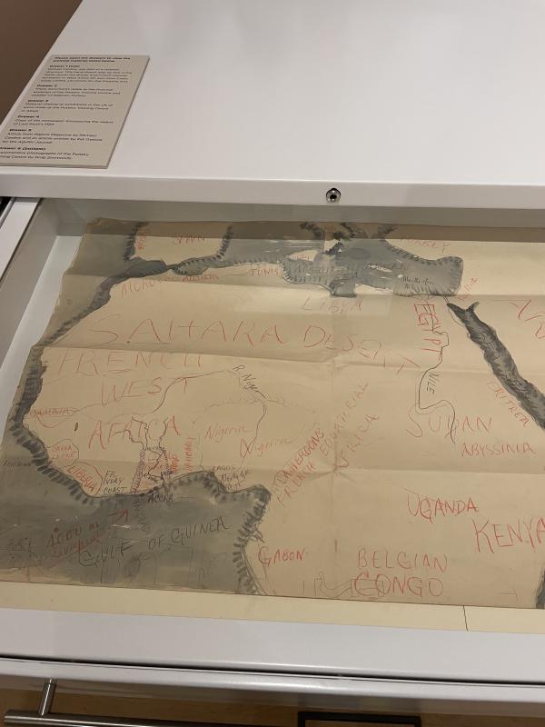 For me, as I read the wall texts and pieced this story together, I found myself becoming more and more clenched. But Iāll show you what really sent me. Thereās a set of white archival drawers in the first gallery; if you go over and open them up, there are little newspaper clippings and magazine cutouts, old letters and stuff like that. The top drawer contains a big hand drawn map of the upper half of the continent of Africa. The paper cuts off the rest around āBELGIAN CONGOā - this label is written in large red capital letters. The sea around the landmass is filled in with murky blue watercolour. In the upper right corner, the land joins up with the Arabian peninsula. It is labelled āARABIAā in the same scrawled red capitals. This map is hand drawn by Michael Cardew. Looking at this map made me feel woozy. I was being pulled in different, opposing directions. Michael Cardew was part of the machinery of colonialism. He was one man - yeah - but he was an active participant in a colonial government, an agent of this colonial governmentās agenda. He intervened in the cultural history of a country that was ruled over, by force, acting on behalf of the colonial government he was a part of. But he also supported and facilitated Nigerian potters, gave them skills and resources, acted as a passionate representative. I donāt know! Maybe Iām being soft but this map is terrible and it makes me feel ill. It is charting a section of a continent that was carved up by European powers. It treats this landscape like it is territory to be conquered, ruled over, catalogued into submission.