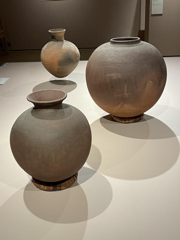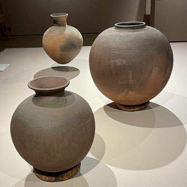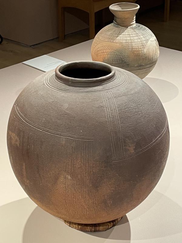 But if weāre really thinking about this, Michael Cardew isnāt the point. The pots on display are not made by Michael Cardew alone and it is also equally tense to get sidetracked by the white guy like heās the only main character. Michael Cardew might have set up the Pottery Training Centre, but now itās called the Dr Ladi Kwali Pottery Centre. Ladi Kwali was an acclaimed potter who made an enormous contribution to cultural history. If you head back through to the second half of the room, there are three large round pots on another low white plinth. These pots have a matte surface. They are round and swollen. They are all different shapes: one has a long neck, one has no neck (only a little protruding rim), the third flutes out a bit further like it is showing off. They are all different red-y orange colours, a mix of terracotta and burnt earth, pastel orange. They are dappled with an ashy grey gradient across them all - like ballooning planets, like Jupiter or the surface of some alien landscape from afar. If you get very very close, you might see them shimmer a bit, because there is a little granular kind of mineral glitter trapped in their surface. There are lines scratched into them all, running in different abstract patterns, perpendicular and modern or crisscrossing like crosshatching. The light just ripples off of them. The grey gradient blows across all three, billowing and webbed, light and cloudy. They were made by Magdalene Odundo - a ceramicist born in Kenya, but she now lives and works in Britain. She studied in Abuja with Ladi Kwali, took what she learned and ran with it - because after Ladi Kwali, there were other women too. It wasāt really Michael Cardew that pioneered that new understanding in Nigerian ceramics, it was Ladi Kwali. Sheās the one that sits in cultural history, at a meeting point of a complex web of lines running from person to person in a sprawling legacy. I donāt know if I believe this truly or entirely, but it is the closest I can get to a happy resolution.