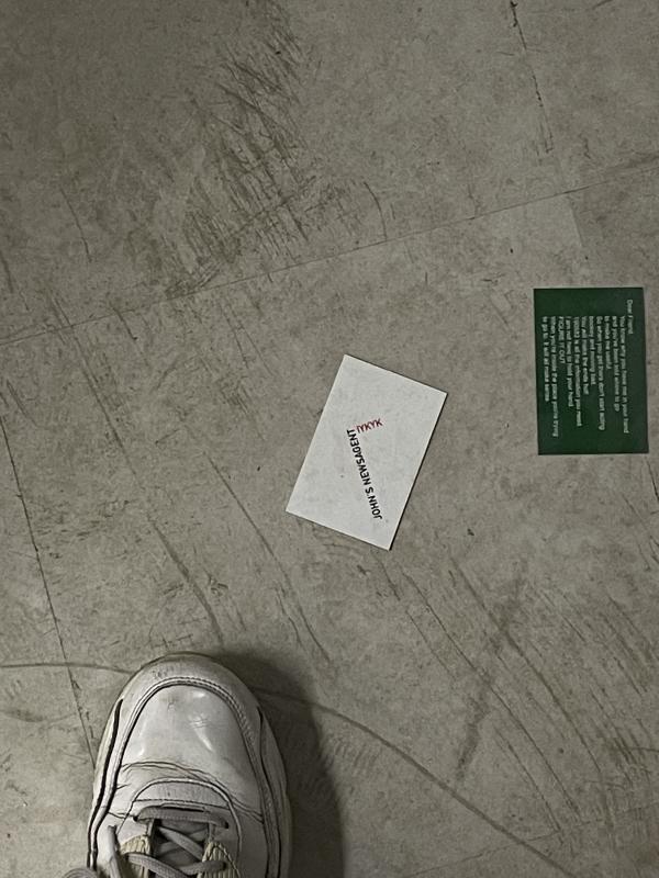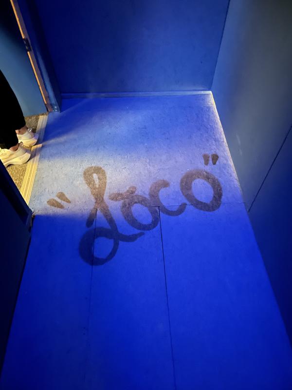 To the side, past the counter, there was a door through to the back. It was ajar, a little grid window giving me a sneak peek of the corridor and its electric blue chipboard walls. There were stars spray painted in little clusters at eye level, as big as dinner plates, or maybe my hand if I splayed it out flat. The corridor was wide enough for one person, two if you both skimmed past each other with your back against the wall. Down the end, dark and moody, was a door with a digital keypad. The numbers flashed up on a touchscreen. I stared at it for 10 seconds, it beeped off. Someone came to whisper to me, ’there are clues if you know where to look for them’. Puzzled, I went back to the main shop. It was bare except for the business cards, so I stooped to pick one up. It was forest green, matte with white text.