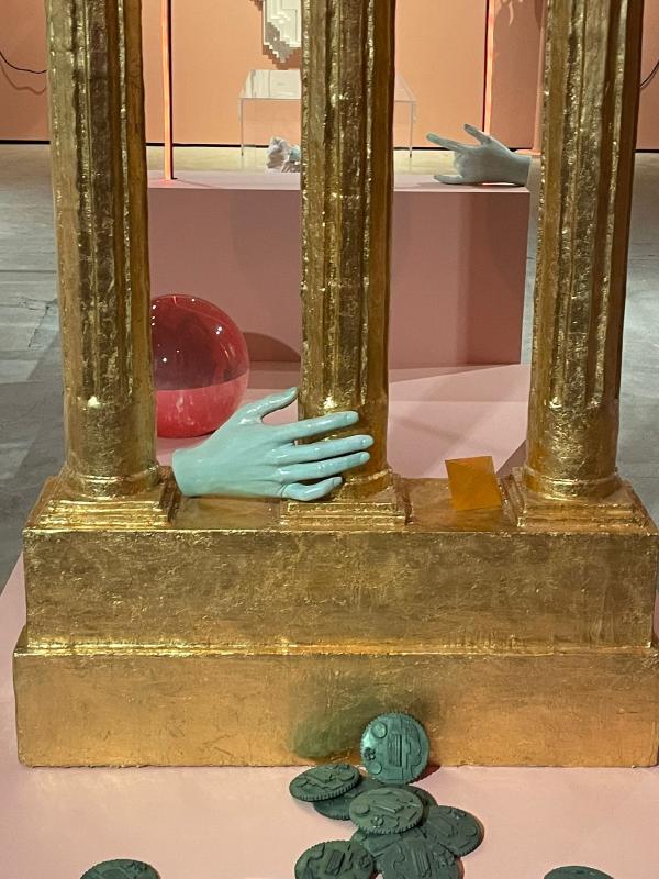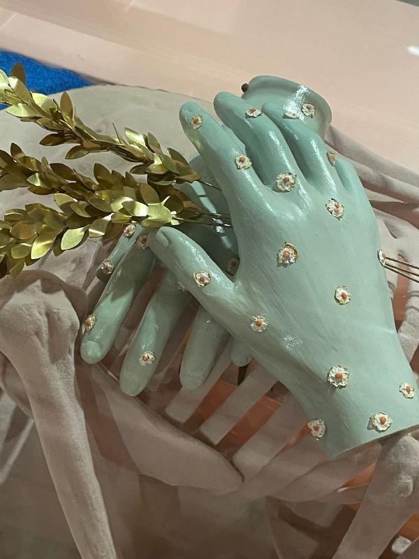 Then, a centrepiece: a gold colonnade, green coins the size of a fist, a disembodied mint green hand, a pink glass orb, amber prism. This is a collection that has fallen out of the reliquary. Flat black circles hang, suspended in the air above. They are horrifyingly solid, thrown into stark matte relief against glowing turquoise glass and green vines. The reliquary is behind, in a glass case: cast of bones (ribcage, femur, skeleton arm) with a mint green hand, holding a gold laurel leaf, containing pink glass, pearl shard, bedazzled by little fried egg studs. A relic of a saint: the sacred body, defiled by the gruesome horror of its death, or made more holy by the quality of suffering. Because through sufferance we understand the suffering of Christ, Man of Sorrows. The reliquary is punctured by flat black circles. It would be a crypt in the same way crypts are dark containers for a body unbound by horror, by sorrow, by suffering—