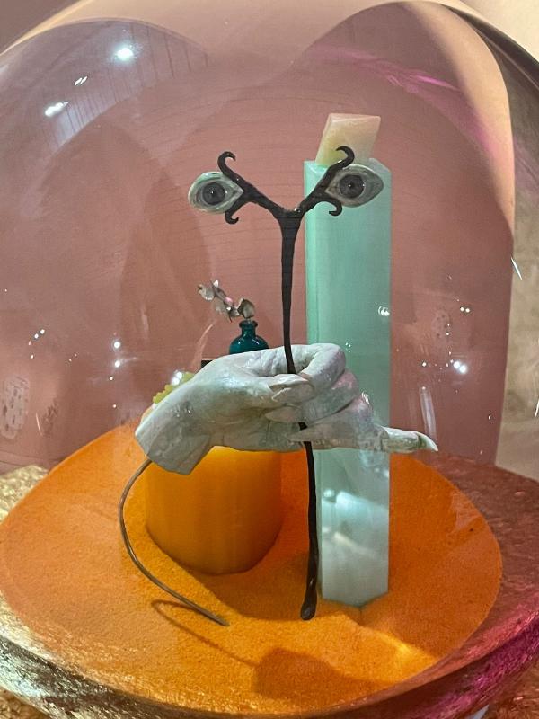 My body is drawn to the hot pink neon glow of the stairs. I tumble down them into a basement (a crypt). It would be a crypt in the same way our stomachs are crypts; dark, the gentle wet pink of interior lining, coated in bile and webbed capillaries. Votive, offering: a giant candlestick towers above us. Cartoon drip melts in a steady stream down the length, into a pool at its base. Static and solid. It’s a prop. It’s camp, or kitsch — I can’t tell the difference anymore, can’t decide. It’s in the space and its giant-ness makes itself known, my body reacts. A relic in a glass orb: a tiny disembodied mint green hand holds two disembodied eyes on a stalk. Saint Lucia, virgin martyr. She gouged out her own eyes, or her eyes were gouged out — on the orders of the emperor or a spurned suitor or — well. She carried Dante to the gates of purgatory as he slept.