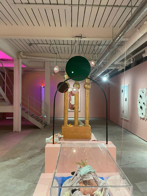 The gallery looks like it used to be a car park. There are steps up at the door. The concrete floor is rough and cracked. SAFE ROUTE in red stencilled caps, spray painted on the floor. The walls are baby pink and the lighting is green overhead. I feel like I am in an enormous mouth, about to begin my journey through to the gentle wet darkness of the small intestine —- to see Tai Shani’s exhibition at Gathering.