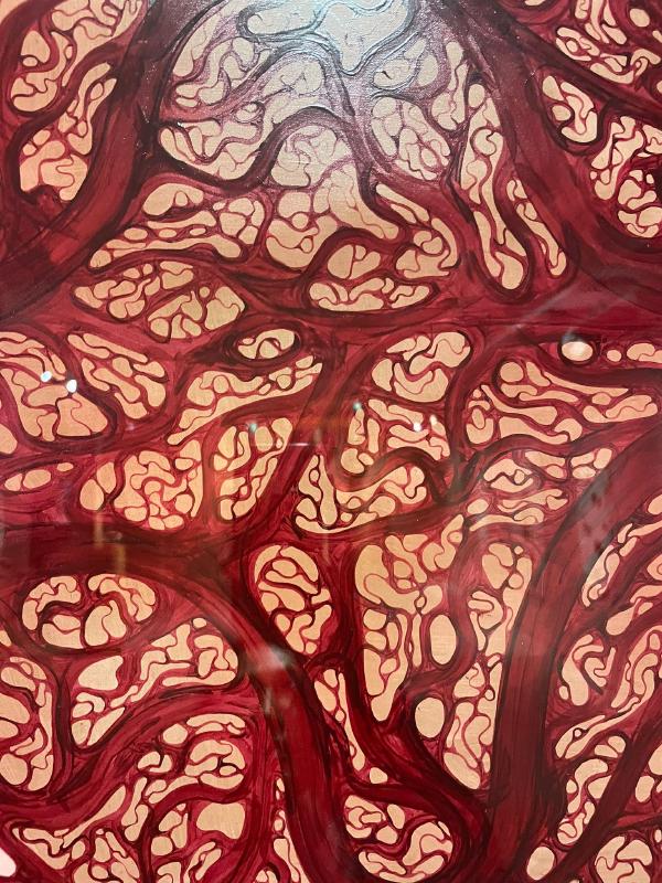 The paintings are bigger down in the crypt. The same ribbons dancing across resonant space and folded architecture. They are the size of altarpieces and here, the dense circles are all black. Voids, spore. The black circles puncture the paintings and leak across the space, through the crypt.