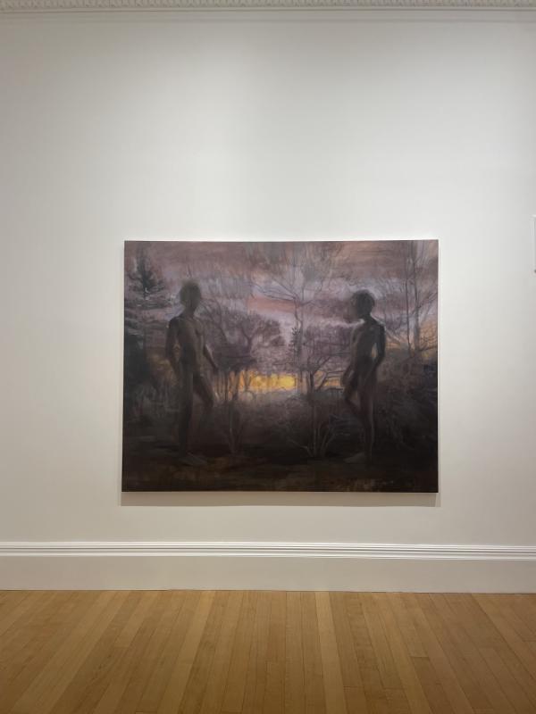 2: Matte surface, wide canvas like an open book. The facing pages are a pleasing mirror. A purple grey landscape where the sky isn’t ripe. It is a wash of cold colour. Below, a murky flat expanse. Bushes and bracken. The misty clouds are low and lilac magic. Two figures are thrust out at us, the mist curling around their heads and throwing them, clear. Wait, no. I can’t decide if they are hazy or clear. They are solid, they have real solid bodies. They feel fleshy and smooth because the light falls over their chests casting real shadows and making them shine silvery cold. But they are blurry too. They don’t have faces and they look like they are more a part of the mist and the landscape than anything else. I can’t decide. They feel less like people and more like bodies, mood, spirit, dream. They look lonely to me. Maybe it is because they are parted? Maybe it’s because they are facing each other but looking out at us. That feels like a kind of loneliness, doesn’t it? To look out at me when they could be looking at each other. It’s an incomplete gaze as soon as I decide to walk away.