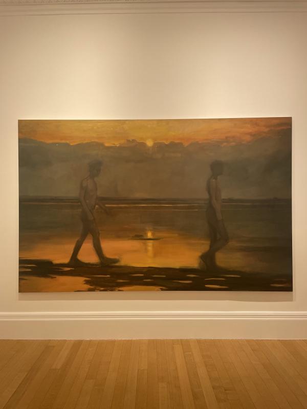 3: Two figures trudge along a flat beach. They are naked. Their skin is dull and matte. The surface of the image is matte, so it all matches. But behind them, an orange sun is peeking out from the top of a wall of dusty blue clouds. A strip of sky visible above the cloud-wall. It is brilliant orange, yellow. The surface of the painting is matte, but this feels like brilliant light. It is reflecting off the bottom half of the painting, wobbling back at me from the water.