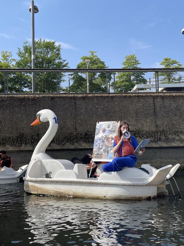 Between those two things (absurdity and objects) thereâs space for something else, I think itâs action, or interaction, movement, play. In the driversâ seat on swan pedalo no. 6, splashing out lazy circles on the water, we parked up amongst the other swans. Rebecca Moss had a megaphone and a clipboard with a swan printed on the back. She was perched on the back of a pedalo with a flipboard propped up next to her. She was delivering a lecture called Dream Machines, about movement, machines, industrialisation, automation, Dada and Surrealism.