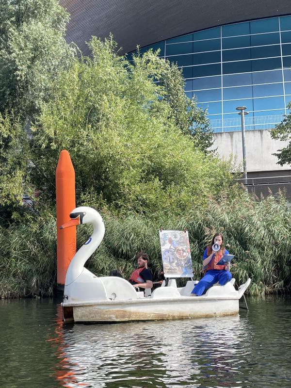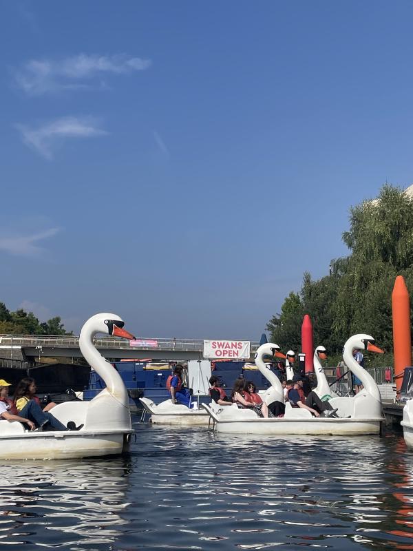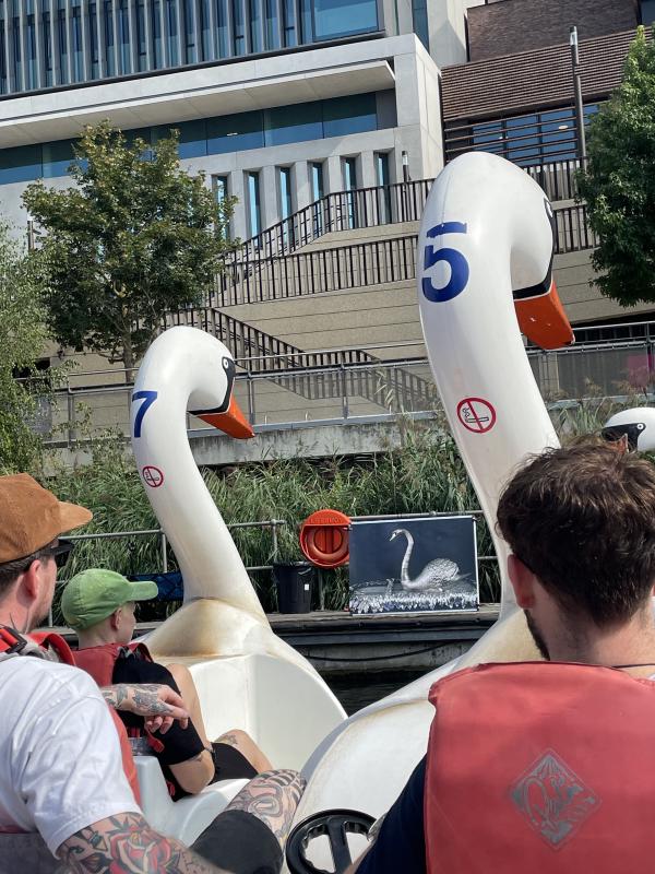 You need something vivid, something to shock the system. Capitalism or modernity, life as we know it, whatever you want to call it. It is such a neat circle, it seems irrefutable, like there is no alternative. Didnât Mark Fisher say that? Capitalist Realism? I donât know, it just seems so glossy and hard, a glass exterior, an impenetrable dreamstate. Rebecca Moss ripped through the circle, good clean fun. We just put our bodies in a different state, outside the lecture theatre and onto the water. Moving about on the water, pedalling along in swan no. 6 â the vivid shock doesnât have to be aggressive or violent to puncture the dreamstate, it can be elegant too. We lined the swans up in a perfect row. Simon said, hey, I wonder whatâs over there? pointing into the reeds along the furthest bank. I didnât know, so we pedalled right into it.