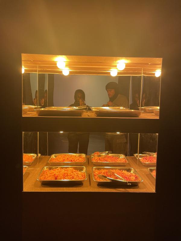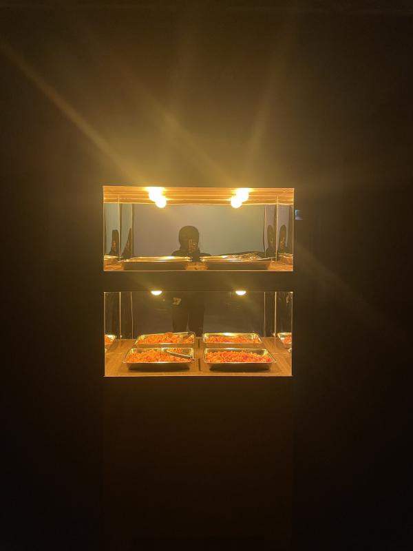 This was only in the gallery for a day. Eight and a half hours, exactly. The door was heavy the room was dark and silent and empty. Empty except for one dark cabinet, a yellow screen and a yellow glow. Itâs funny, the yellow glow is the most immaterial component, but it was the first thing I saw. The cabinet was facing away from the door, a shadowy body with its back to me. I walked round to see its face. Yellow glow. A tight square and very blinding. Two wooden shelves with two metal trays on each, doubled up again because the cabinet is mirror backed (2,4,8, quick maths). The light bending against the mirror, gleam on steel. Top shelf: jhuri if I am Bengali, sev if I am Gujarati, fried crunchy things made of gram flour if I am talking to you English. Bottom shelf: boondi, which is the same in both languages. One is salty and savoury and spicy, you are meant to mix it with puffed rice and spicy potatoes, lemon, red onion and green chilli. One is syrupy sweet, almost sickly, meant to be packed tight into a sugar crusted ball (a laddoo to me). But there were metal tongs and one paper cup, there I was mixing them together, listening to instructions. I ate them in the dark facing the yellow glow. Over my crunching I could hear something. Not silence, brown noise. I thought it was a fan whirring in the background, something else or, I donât know. It barely registered until I stood in it.