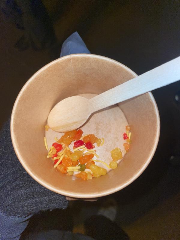 Back to the gallery. Laisul Hoqueâs An Ode to All the Flavours was only in the Whitechapelâs Gallery 2 for eight and a half hours. The snack in the cabinet is unusual, unconventional. Itâs like dipping Maccies fries into a Maccies milkshake, a mix of separate things that come together to make a personal foible. Itâs the artistâs fatherâs favourite snack. Thereâs a text on the back of the press release where Laisul describes a childhood memory of walking to a sweet shop with his Dad to eat this specific snack mix, holding his hand, feeling like there was an emotional intimate exchange in the sharing of this snack. A personal foible, a part of the person, a quirk. The text describes that the artistâs father is quite a conventional man, unemotional, thereâs a distance between them. This cabinet is a monument to fleeting moments when there is no distance, only intimacy, only being known and seen and loved entirely for the tender soft spots, for the quirks and foibles, these delightful and human things that are ultimately only small. But the world is made up of small things, the small things are the entire point. This is a loving portrait, it conceals and reveals something precious.