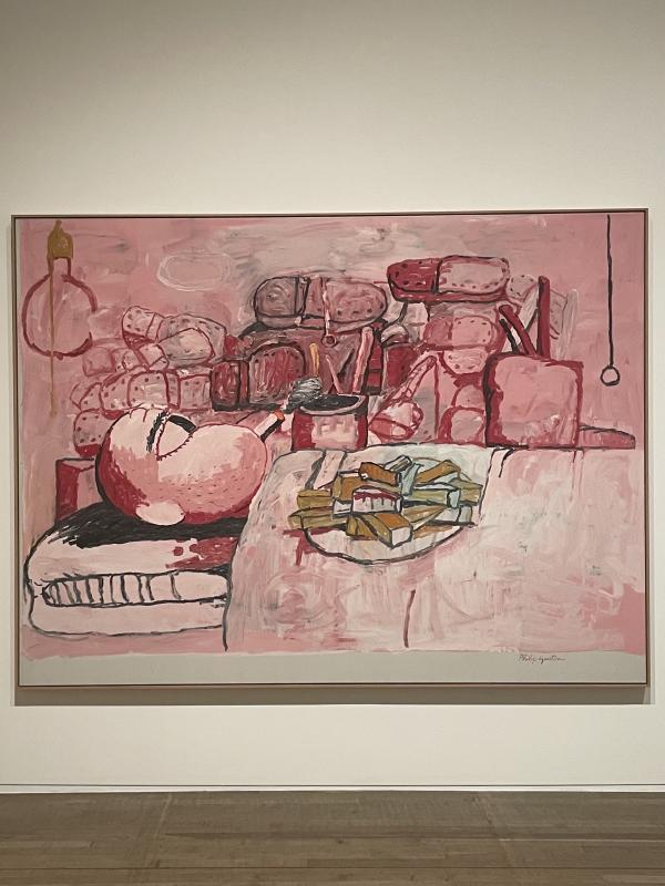 The painting is pink and red and white. There are black outlines and grey smudges. Only the chips are yellow. The painting is PINK. And Philip Gustonâs pinks are not that solid, as colours go. Theyâre flat but theyâre also streaky. Theyâre also so opaque that they must be solid and they must be real. They make me question the world around me. They make me feel genuine love and emotion, but I think the main emotion is queasiness and the love is dizzy. Did he paint wet on wet? Or wet on tacky dry? On gooey dry thatâs actually only dry at the surface? Whatâs the equivalent textural state to parboiled for oil paints? How do you make oil paint look like melted, stretched out, overchewed and anemic chewing gum? Liquid plastic.