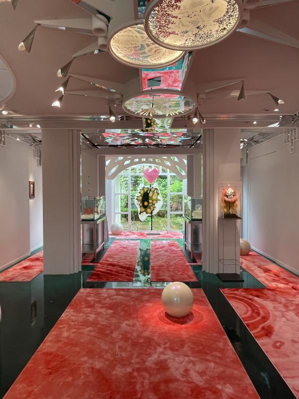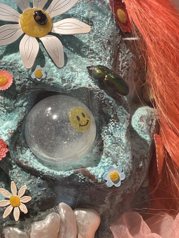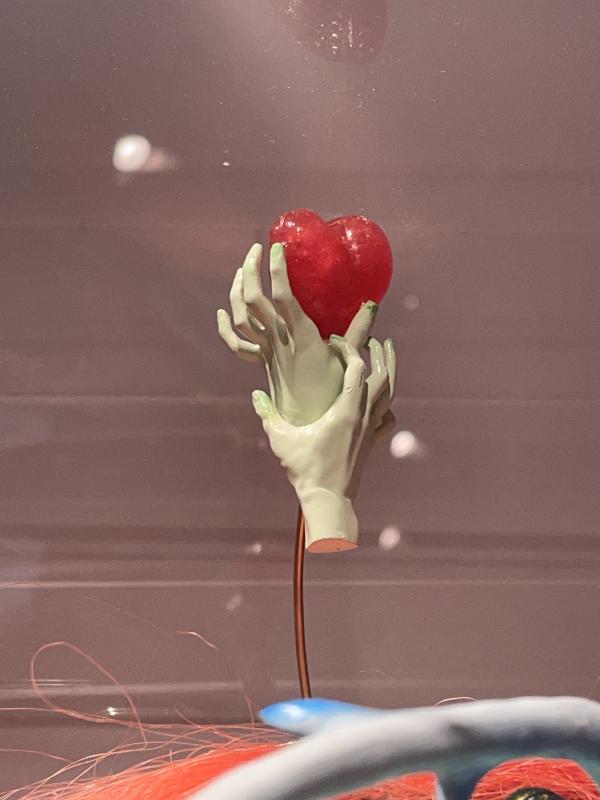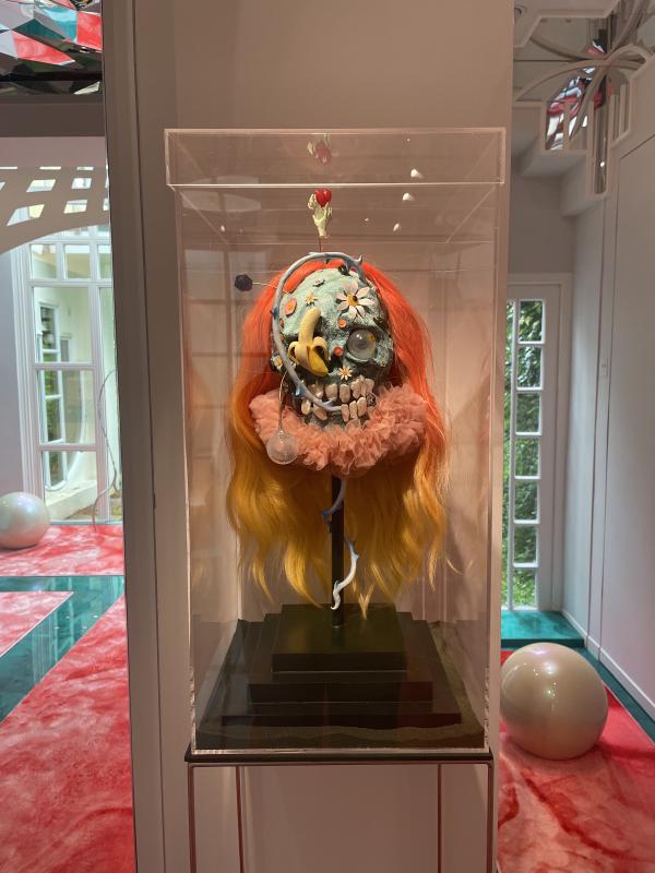 The galleryâs green floor is part covered by fleshy pink red rectangular rugs. A pink heart balloon, I think made of glass. Tethered to the ground and propped up in suspension by a twisted metal rail tied in a bow. A glassy flat pancake of a melting eye â like spat phlegm with cellular blobs, spots radiating inside out of them. In the centre, the mitochondria or the pupil (in the centre of that, a yellow smiley face). A fossilised blue skull with transparent ping pong ball eyes (one eye dangles out, replaced by a half-peeled banana), forehead studded with little plasticky flowers and gems. Its bone texture looks like oxidised copper, the visual texture of fizzy sour cola sweets. Oversized mother of pearl teeth crowding out its skeletal mouth. It is wearing a pink frilly ruff and an orange wig with beachy ombre waves. Two miniature green hands are rising out of the skullâs crown, clasping desperately onto a cartoon red heart. A silky green print hangs on a curved wall â twisting green ribbons and milky bubbles, black holes and architraving. Two pearls the size of foot stools, iridescent holographic and solid. Two fishtanks.