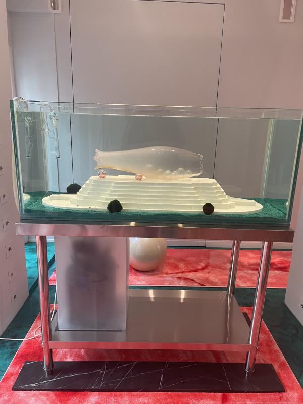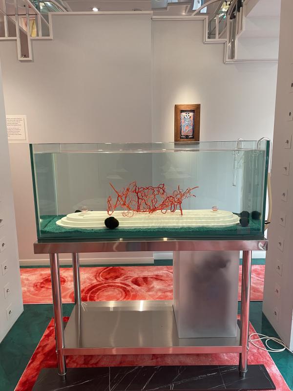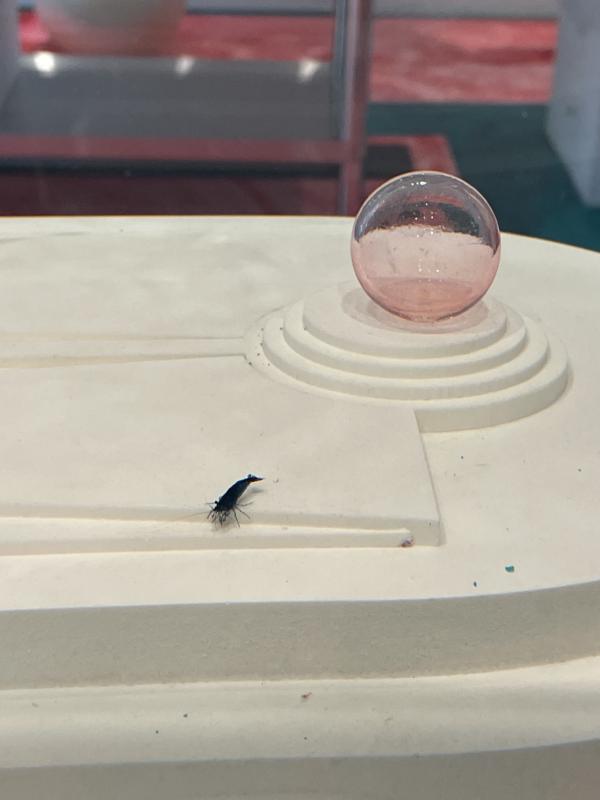 The fishtanks are interesting to me. They face each other, mirrored in double. Both have a raised dais, a little stepped stage to present beautiful items: one with a baby pink glass fish shape full of iridescent glass bubble eggs, the other with what looks like the fishâs veins and arteries pulled out like a twisted tangled red ribbon. Both have blue fish tank pebbles lining the bottom, both are populated by tiny blue baby shrimp. They are so small I have to get very close to the glass to see them, so close my breath fogs the glass. They are so blue. Kind of teal or royal blue, really really blue and blue all over. I didnât know shrimp this colour even existed. But the shrimp are like the perfect true audience for this art â forced to move around it, live alongside it, luxuriate in the grand classical architecture of it, wiggling around and through their home in the weird negative space. I donât understand their experience. For me, as a human viewer, itâs an over-there art object â I peer into their domestic environmental interior like it is a perfect, sweet vignette. But for them, ah â the space is all at a different scale.