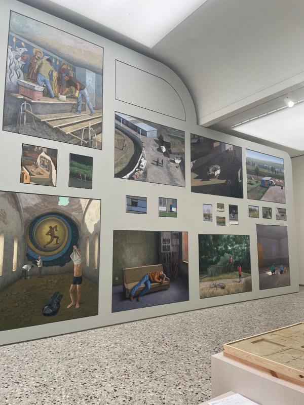 On the inside, Romaniaās pavillion was exceptionally wide and not very deep. A room that felt panoramic. Full of Serban Savuās installation, What Work Is. On the wide wall facing me, about 40 paintings hung in one big overwhelming salon-style cluster.