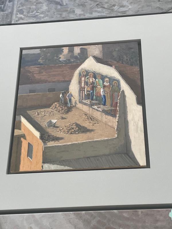 Zoomed out droneās eye view of a man standing on the back of a flat bed truck, driving away from a pile of burning rubbish. A man in an Adidas tshirt interacts with a pile of plywood that takes up half of an empty room. A group of barechested men dig out an excavation site, exposing a dirt stairwell and a mural of horses, wild boars and cavemen. Another droneās eye view of a half demolished house with only half a wall standing, two men in hard hats shift piles of bricks and a scaffolding tower lifts two other men up to eyelevel as they restore or paint a mural of 5 saints. Two figures perch on the side of a road in heavy jackets, the expanse around them is grey and bare. A man sleeps on a sofa next to a switchboard with trailing wires. A man pops his head out of an apartment window, he is wearing a hardhat, the painting is cropped tightly around the window and the window is cropped tightly around his face. A droneās eye view of a farm track with concrete grey yard, corrugated metal outhouses, bags of grit and sand, three figures gathered chatting in blue overalls. A figure unloads a truck in the shadow of two other buildings. Three men laze on a grassy hill, one of them is lying propped up by a fallen tree. Two men abseil down the side face of a concrete building in hardhats.